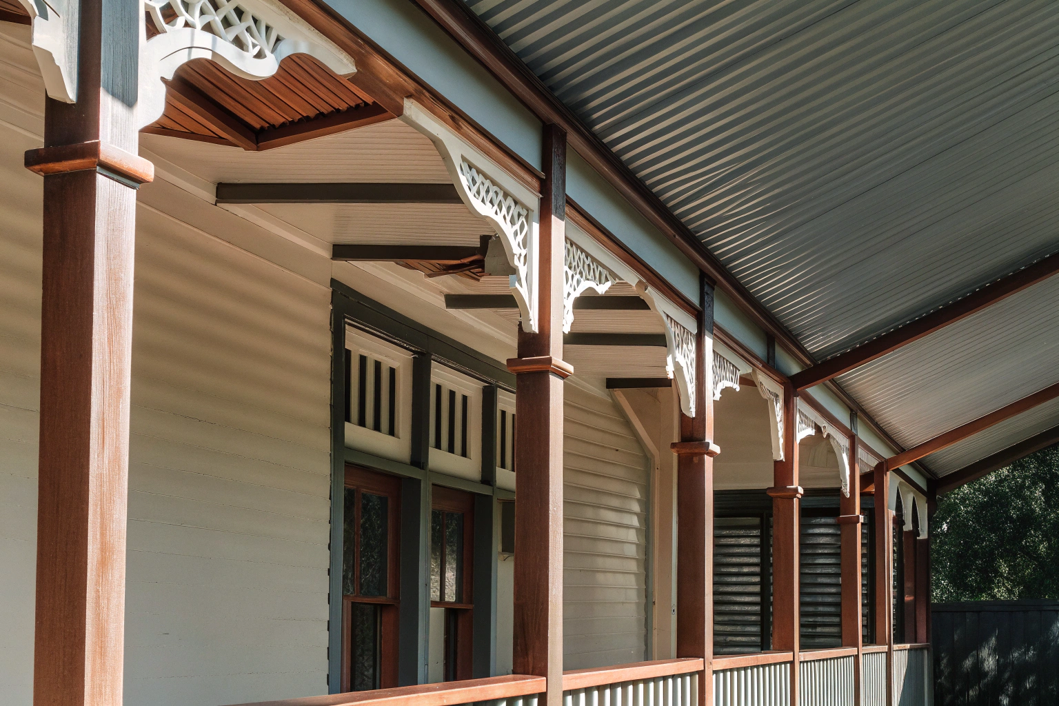 We build classic Queenslander verandahs with authentic post and beam construction and traditional timber detailing. Our wraparound designs feature decorative brackets, timber posts, and heritage-style roofing that suits older Gold Coast homes and character properties. We use proper tongue and groove ceilings, traditional balustrades, and period-appropriate finishes that match your home’s original architecture. These verandahs work particularly well for homes in established suburbs where maintaining character and street appeal matters.